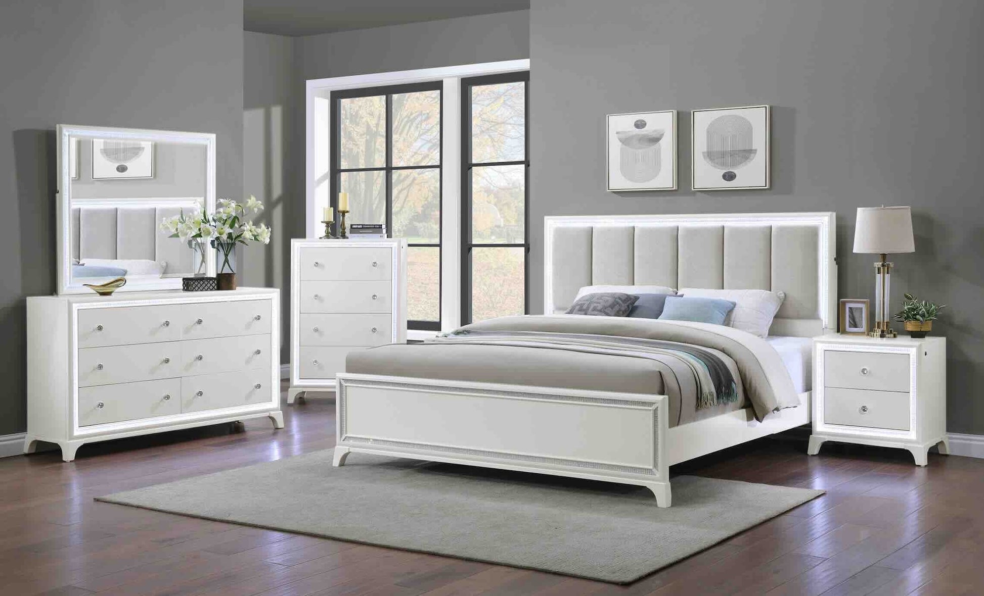 The Salma Bedroom set exudes modern elegance with its clean lines and sophisticated design. The sleek white finish is complemented by a beautifully upholstered headboard with vertical paneling, adding a touch of softness and refinement. Integrated LED lighting on the headboard and mirror enhances the contemporary appeal, creating a subtle ambient glow that elevates the atmosphere. The set includes a spacious dresser, a tall chest, and nightstands, all featuring crystal-like knobs that add a glamorous touch. With its blend of modern aesthetics and functional design, the Salma Bedroom set brings a fresh and stylish charm to any bedroom, making it a perfect retreat for relaxation and comfort.